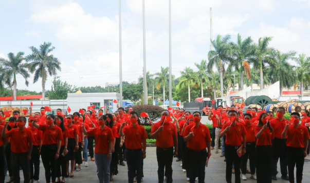 盛夏七月,热情似火!尊时凯龙公司已是党旗飘扬,处处洋溢着喜庆祥和的气氛。当日上午,身穿“中国红”T恤的党员等参会人员有序入场,列队数字“100”庆祝图案,表达对中国共产党的无限热爱。随着主持人一声令下,伴随着激昂雄壮的国歌声,护旗手奋力将鲜艳的五星红旗抛向天空,国旗迎着清晨第一缕阳光冉冉升起,全体人员庄重注视国旗,高唱国歌,脸上写满了骄傲与自豪。